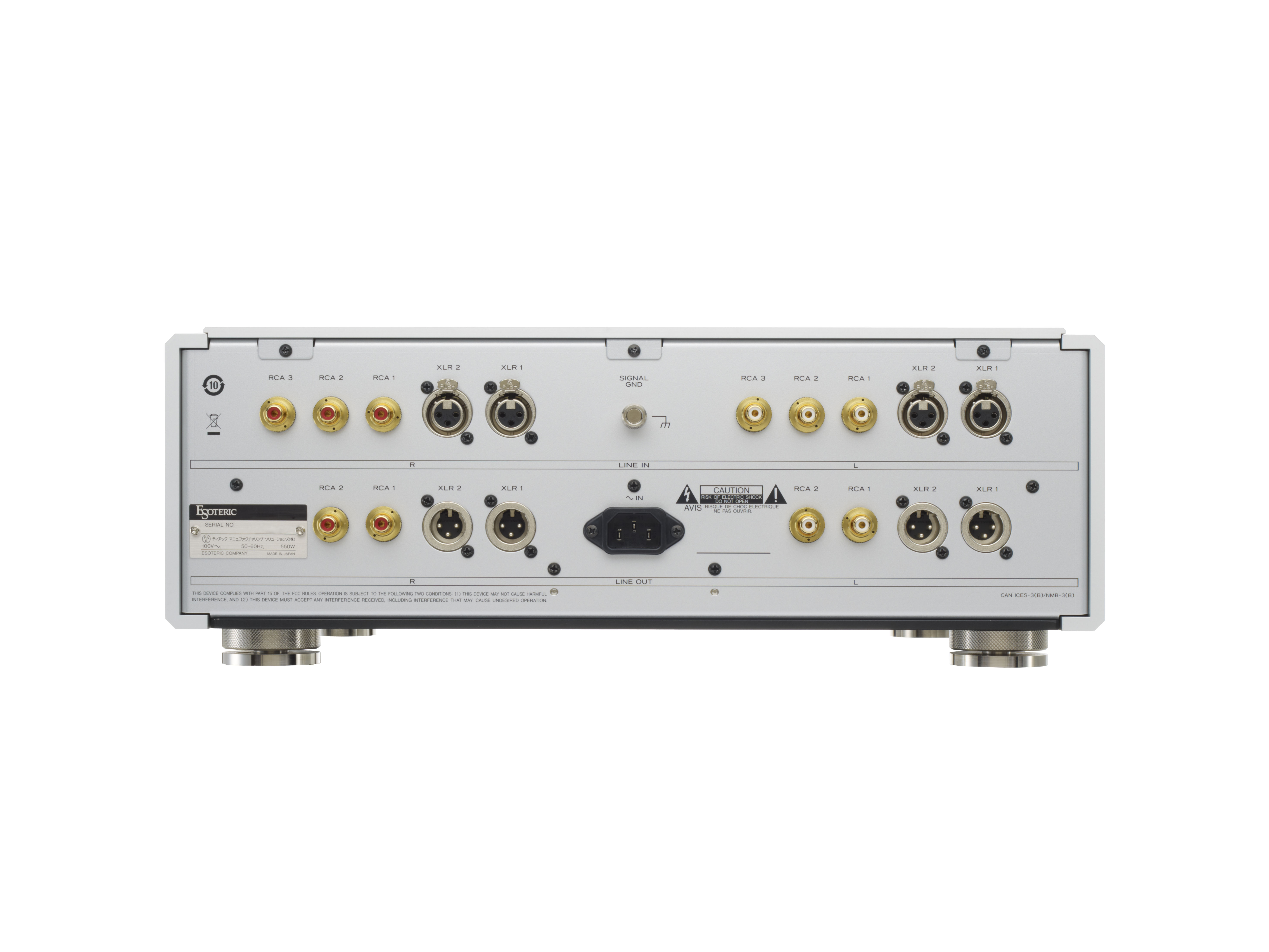 The C-02X’s optimized chassis design features a 2-layer 5-cell configuration that houses each circuit block in its own compartment. This structure shortens the signal path to help minimize inter-circuit interference. The chassis’ 5mm-thick steel bottom plate and thick aluminum exterior panels are supported at 4 points by Esoteric’s own patented ‘Pinpoint Feet’ (patent No: JP4075477), which enhance chassis rigidity while effectively suppressing resonant vibration.