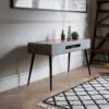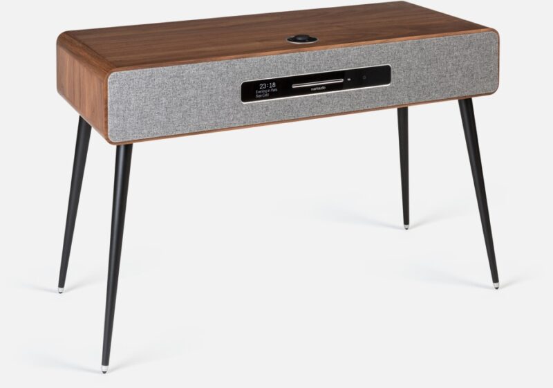 - Rich Walnut veneer with Lead Grey grille fabric and satin black spindle legs