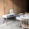 - Soft Grey lacquer with Lead Grey grille fabric and natural cherry spindle legs