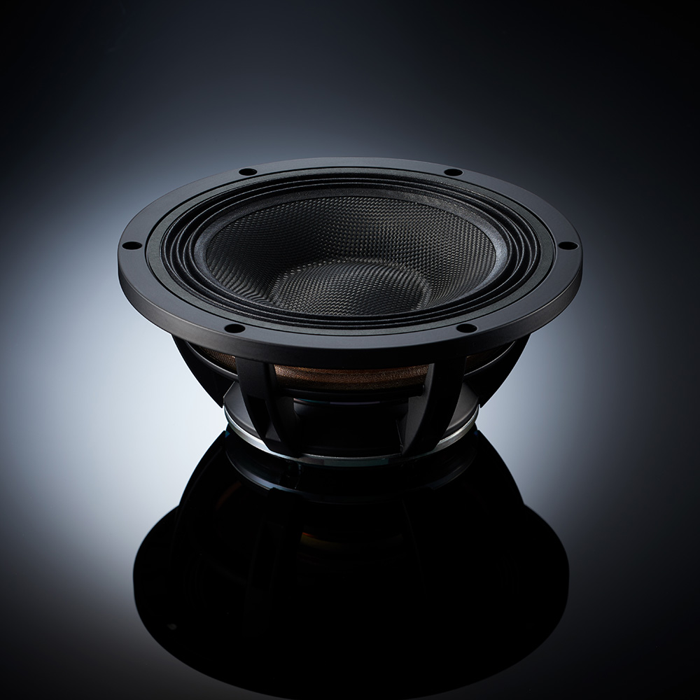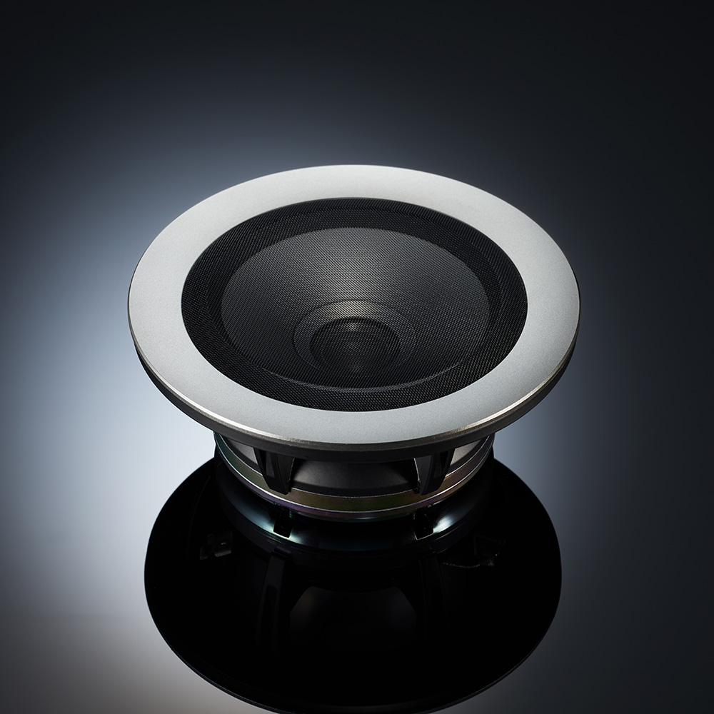 We have upgraded the diaphragm for the 18 cm woofer to a MACS II* diaphragm. It is made of five layers of woven and non-woven fabric to optimize the vibration characteristics of the shell-shaped diaphragm that integrates the center cap and cone into a single piece. Other ingenious woofer design features include a molded rear cradle that fully conveys the powerful driving force of the large neodymium magnet, and the turbulence-suppressing aerodynamic design of the rear side. Our attention to detail even extends to the material, configuration, and finish of the surround: The corrugated surround is coated with damping material, which is also found in our professional speaker units. All these refinements have resulted in a richer and clearer bass and the smooth, coloration-free reproduction in the mid-to-low frequency range.